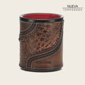 Juego de cubilete Cuadra en piel genuina de cocodrilo y piel de bovino. La parte externa presenta tejido artesanal que enmarca la piel de cocodrilo, grabado láser y sombreado a mano. Con logotipo Cuadra grabado sobre la piel de bovino. Incluye 5 dados uno de ellos personalizado con el monograma de la marca.