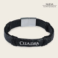 Pulsera para caballero en piel genuina de cocodrilo. Presenta aplicaciones y forro en piel genuina de bovino. Al centro con componente Cuadra en acabado platino. Ajustada con broche de acero inoxidable. . Diámetro aproximado: 6.3 cm.