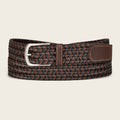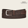 Cinturón casual para caballero en piel de bovino. Con tiras de piel en colores contrastantes entretejidas de manera artesanal. Con hebilla metálica.