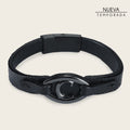 Pulsera para caballero en piel genuina de lizard con aplicaciones de piel genuina de bovino y tejido. Ajustada con broche de imán. Al centro con herraje del monograma Cuadra. Diámetro aproximado: 6.3 cm.