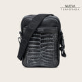 Bandolera para caballero en piel genuina de fuscus y piel de bovino. Presenta contraste de texturas, aplicación metálica del logotipo Cuadra y acabado platinado. Con dos compartimentos asegurados con cierre, el de mayor tamaño cuenta con dos bolsillos internos. Con asa de textil ajustable.