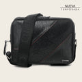 Bandolera para caballero en piel genuina de mantarraya y piel de bovino. Al frente presenta perforaciones láser y aplicación metálica del logotipo Cuadra. Con dos compartimentos con cierre, cuatro espacios para tarjetas y dos bolsillos internos uno de ellos asegurado con cierre. La parte trasera cuenta con un bolsillo con cierre. Con asa textil ajustable.