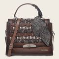 Bolso de mano para dama en piel genuina de bovino. Al frente presenta aplicación metálica del logotipo Cuadra, entretejido artesanal con contraste de color y aplicación de cristales auténticos swarovski. Con asa larga ajustable y desmontable y asa corta envuelta con una mascada de piel de ovino perforada que finaliza en un moño. Cuenta con un compartimento en la parte trasera y con dos compartimentos en el interior uno de ellos asegurado con cierre. Asegurada con broche metálico e imanes.