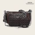 Bolso crossbody para dama en piel genuina de bovino. Compuesta por dos bolsos desmontables, uno de ellos presenta tejido artesanal y contraste de colores. Presenta aplicaciones metálicas de logotipo Cuadra al frente de ambos bolsos y cadena metálica decorativa al frente. Asegurado con cierre. El bolso de mayor tamaño cuenta con dos compartimentos en su interior, uno de ellos con cierre. Con asa larga de tela ajustable y desmontable, de ella cuelga un bolso tipo monedero desmontable con tejido artesanal, aplicación metálica de monograma Cuadra y contraste de colores asegurado con cierre.