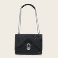 Bolso de hombro para dama en piel genuina de mantarraya y piel de bovino. Presenta grabado láser, bordado, tejido en alto relieve, trenza de textil. Dos compartimentos internos, uno asegurado con cierre. Ajuste con broche metálico. Con asa de cadena doble que puede alargase para usar como crossbody. Asegurado con broche.