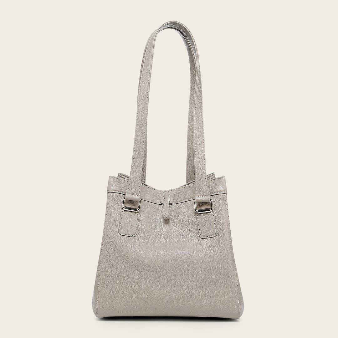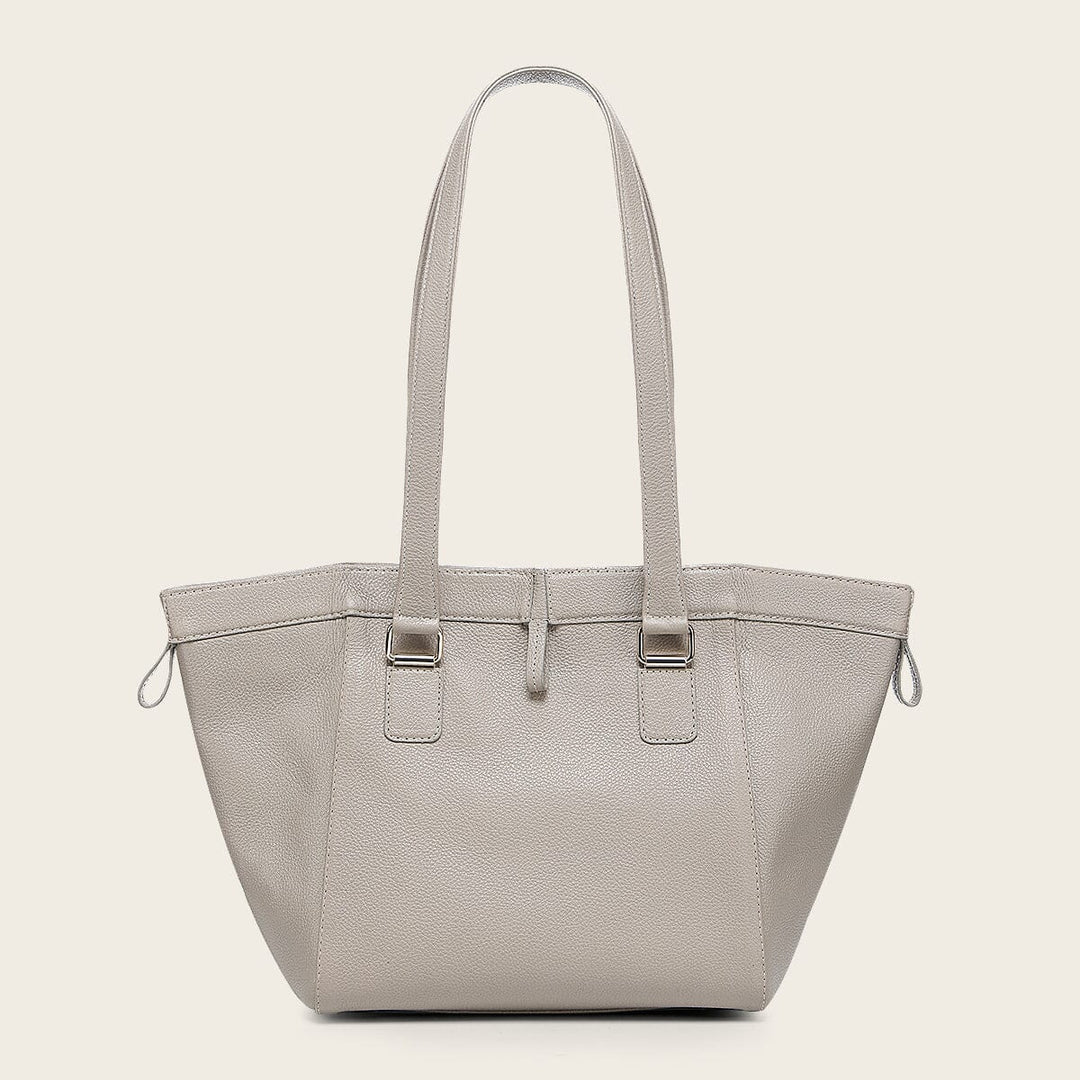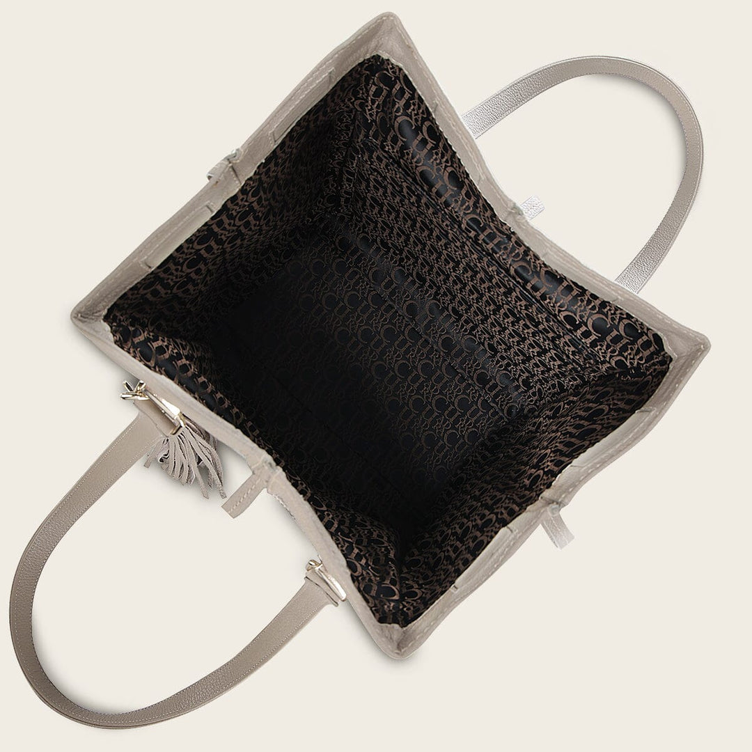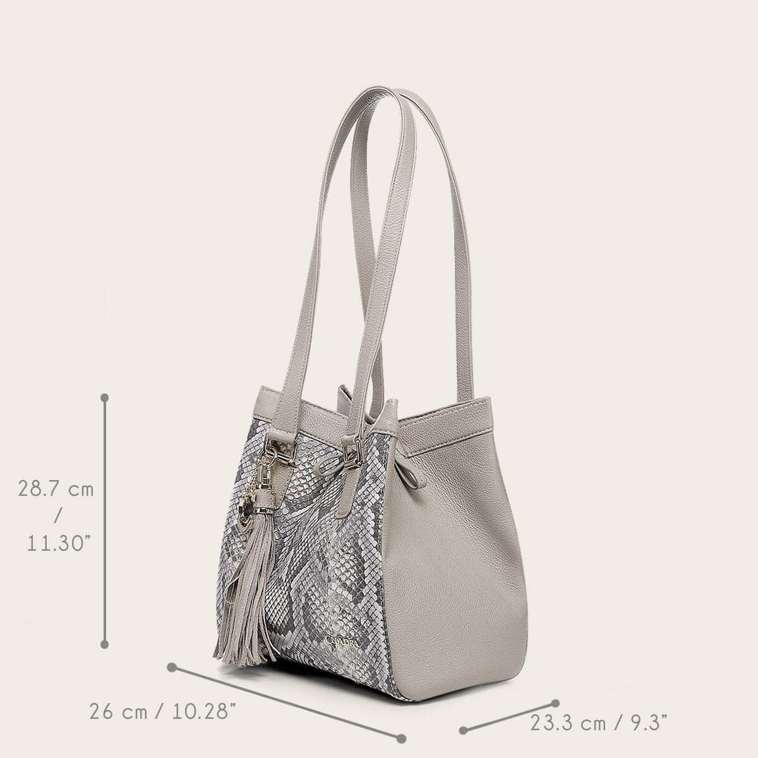 Bolso tote para dama en piel genuina de pitón y piel de bovino. Presenta una aplicación doble del monograma Cuadra y tejido artesanal. Incluye asa larga forrada en piel de bovino y borla de piel colgante. En su interior cuenta con tres compartimentos. Asegurada con imanes. Este modelo tiene dos formatos de uso, abierto como bolso tote clásico o con los lados doblados hacia adentro y sujetos con imanes.