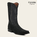 Bota vaquera Orígenes para caballero en piel genuina de elefante y bovino. Presenta herraje metálico del monograma de la marca sobre piel genuina de elefante, bordado en alto relieve, tejido artesanal y grabado láser en motivos orgánicos. Cuenta con el logotipo Cuadra en el costado y en la parte trasera, la leyenda “Cuadra Tradicional”. Con piel genuina de elefante en las orejas. Suela de cuero con injerto de TPU antiderrapante.