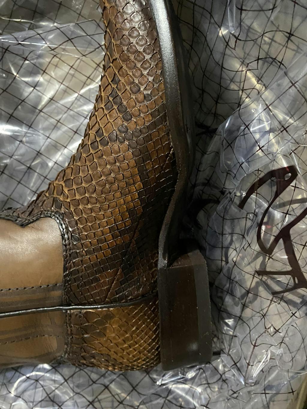 Bota tradicional para caballero en piel genuina de pitón y piel de bovino. Diseño con detalles grabados en tubo, una combinación de líneas orgánicas en conjunto con el exclusivo logotipo Cuadra. Modelo pintado a mano.