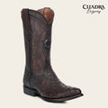 Bota vaquera Orígenes para caballero en piel genuina de avestruz y bovino. Presenta acabado pintado a mano, herraje metálico del monograma de la marca sobre piel genuina de avestruz bordado en alto relieve, tejido artesanal y grabado láser en motivos orgánicos. Cuenta con el logotipo Cuadra en el costado y en la parte trasera, la leyenda “Cuadra Tradicional”. Con piel genuina de avestruz en las orejas. Suela de cuero con injerto de TPU antiderrapante.