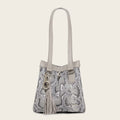Bolso tote para dama en piel genuina de pitón y piel de bovino. Presenta una aplicación doble del monograma Cuadra y tejido artesanal. Incluye asa larga forrada en piel de bovino y borla de piel colgante. En su interior cuenta con tres compartimentos. Asegurada con imanes. Este modelo tiene dos formatos de uso, abierto como bolso tote clásico o con los lados doblados hacia adentro y sujetos con imanes.