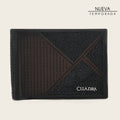 Cartera en piel genuina de mantarraya y piel de bovino para caballero. Al frente presenta bordado lineal en contraste de color y textura y aplicación metálica del logotipo Cuadra. En su interior cuenta con seis espacios para tarjetas y dos espacios para efectivo. Cuenta con un tarjetero extraíble en piel de bovino con espacio adicional para cinco tarjetas.