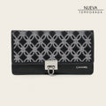 Cartera para dama en piel genuina de bovino. Al frente presenta aplicación metálica del logotipo, bordado en alto relieve en color contrastante y perforaciones láser en motivos geométricos, sobre fondo en contraste de textura. En su interior cuenta con dieciocho espacios para tarjetas y cinco espacios para efectivo. Asegurada con broche.