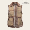 Chaleco para caballero en piel genuina de ovino con acabado nobuck. Presenta pelo genuino en la parte externa y en el interior, un bolsillo interno y dos bolsillos laterales. Ajustada con botones.