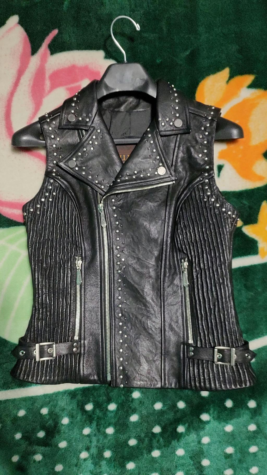 Chaleco tipo biker para dama en piel de ovino. Presenta remaches y estoperoles al frente y en la parte trasera. Con bolsillos laterales asegurados con cierre. En los costados presenta aplicaciones elásticas de piel y correas decorativas sujetas con hebillas metálicas. Ajustado con cierre frontal.