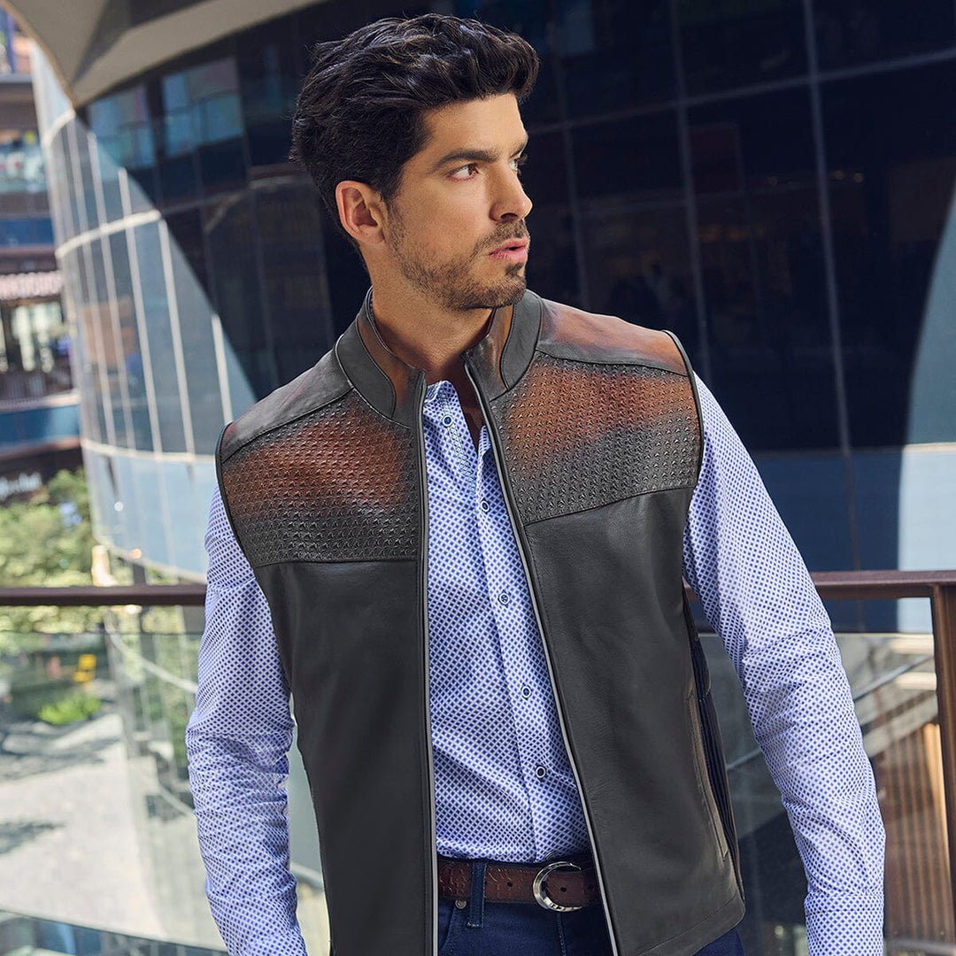 Chaleco para caballero en piel genuina de ovino. Con bordado capitonado y aplicaciones textiles en los hombros, espalda y costados. Cuenta con dos bolsillos laterales y dos bolsillos internos. Ajustado con cierre frontal.
