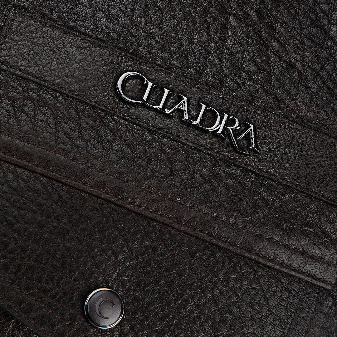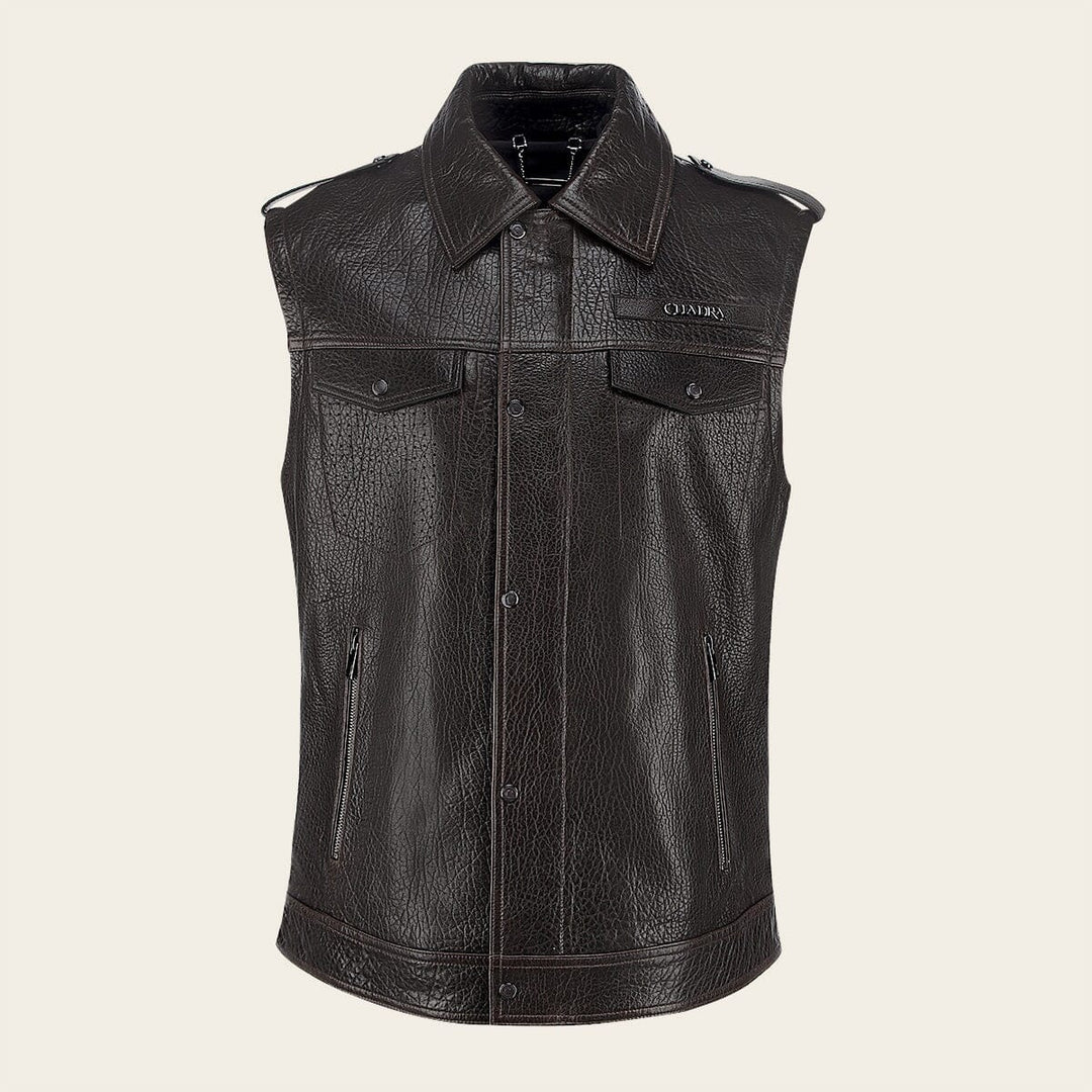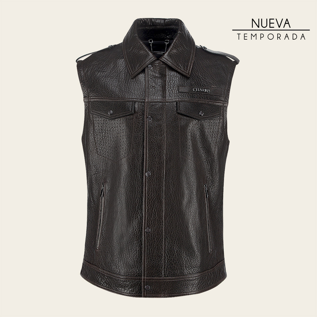 Chaleco para caballero en piel genuina de ovino. Presenta dos bolsillos laterales ajustados con cierre y dos frontales ajustados con broches, con aplicación metálica del logotipo Cuadra en pecho y dos correas en hombros ajustadas con broches. La parte interna con un bolsillo ajustado con cierre. Ajustada con broches de presión al frente.