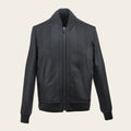 Chamarra bomber jacket para caballaro en genuina piel de ovino. Presenta piel ultra suave. Con cardigan en cuello, puños y pretinas con lineas en color contrastante. Ajuste por la parte central delantera con cierre y jaladera de hueso de bufalo. Presenta dos bolsillos frontales con cierre y jaladera. La parte interna incluye un bolsillo con cierre. No cuenta con forro.