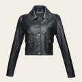 Chamarra para dama en piel genuina de ovino ultrasuave. Presenta dos bolsillos frontales asegurados con broches de presión con logotipo de Cuadra. Ajuste frontal con broches de presión. Con forro ligero.