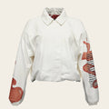 Chamarra para dama en piel genuina de cordero. Presenta estampado en contraste de color, dos bolsillos laterales y elástico en puños y borde inferior. A justada con cierre y broche.