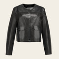 Chamarra para dama en piel genuina de cordero. Presenta sutiles perforaciones láser, dos bolsillos al frente asegurados con broche y ajuste frontal con broches de presión. Sin forro.