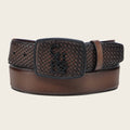 Cinturón para caballero en piel genuina de bovino. Presenta hebilla con grabado y perforado láser. Con aplicación metálica de monograma Cuadra. Color café.