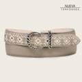 Cinturón para dama en piel genuina de bovino. Presenta fino bordado en relieve y perforaciones láser en motivos geométricos sobre fondo en contraste de textura. Hebilla personalizada con motivos de cadena. Con forro en piel de bovino.