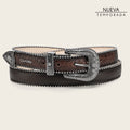Cinturón western para dama en piel de pitón y piel bovino. Presenta aplicación de fina cadena en los bordes de la tira y aplicación metálica en la punta. Con hebilla western de 28 mm grabada en motivos orgánicos y forro sillero en piel de bovino.