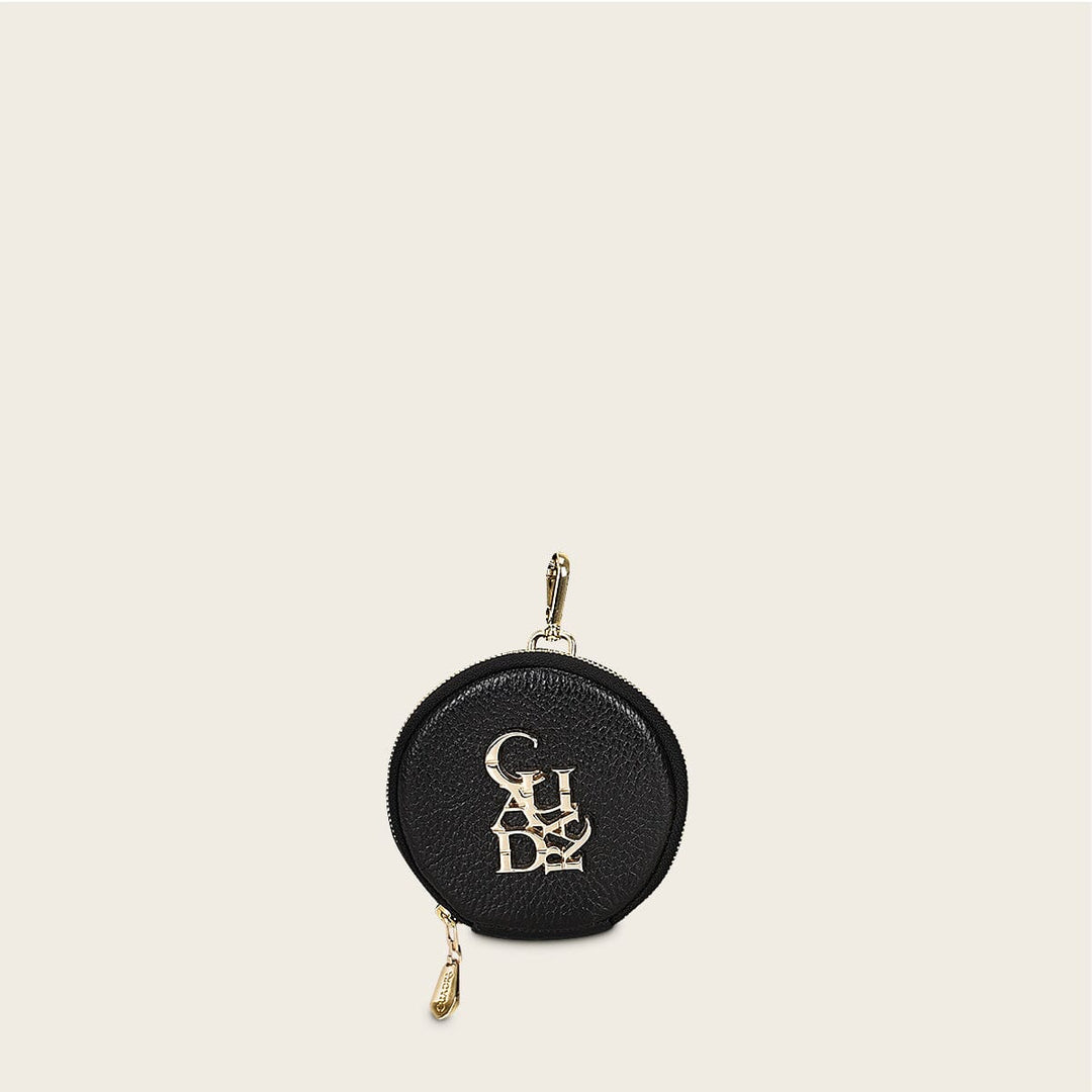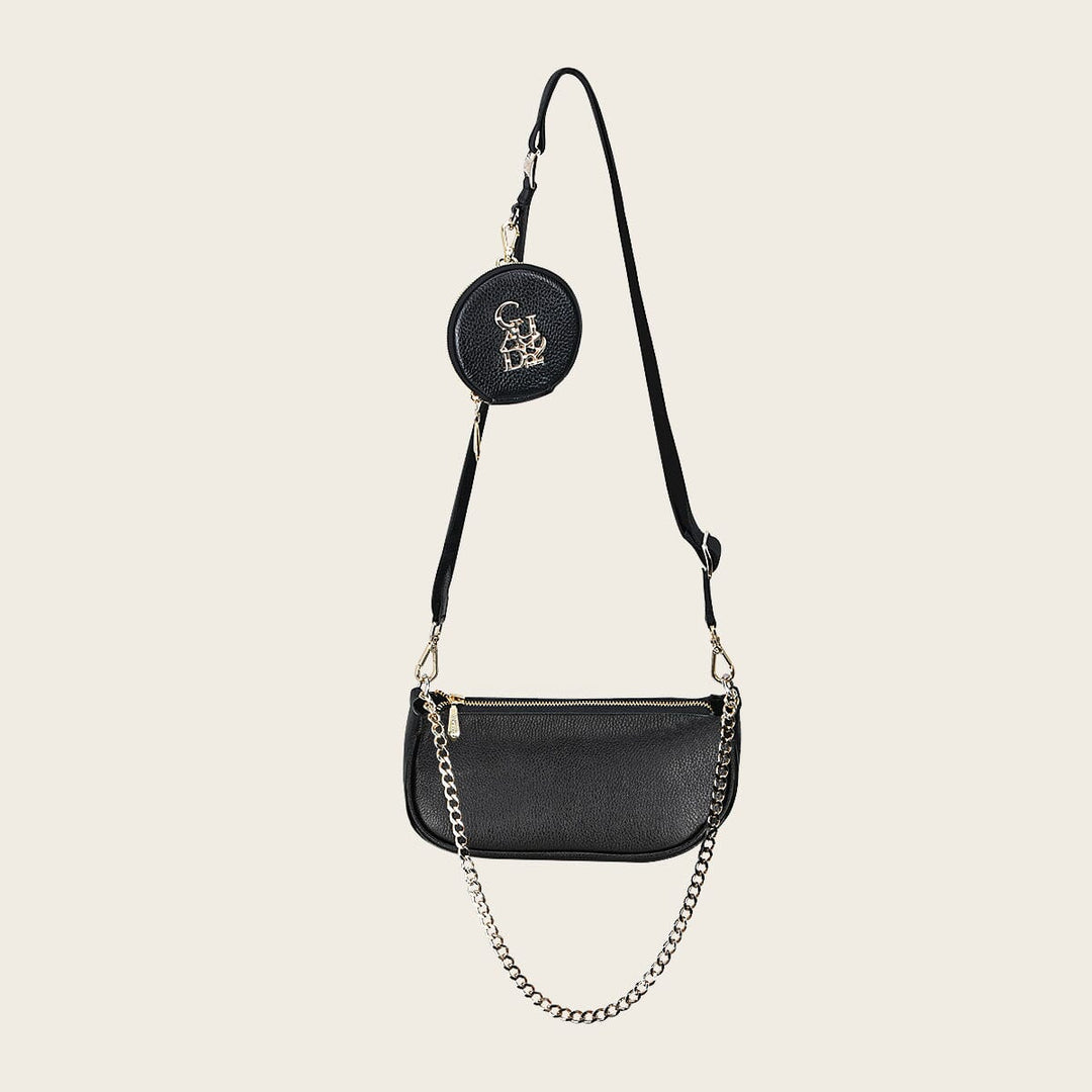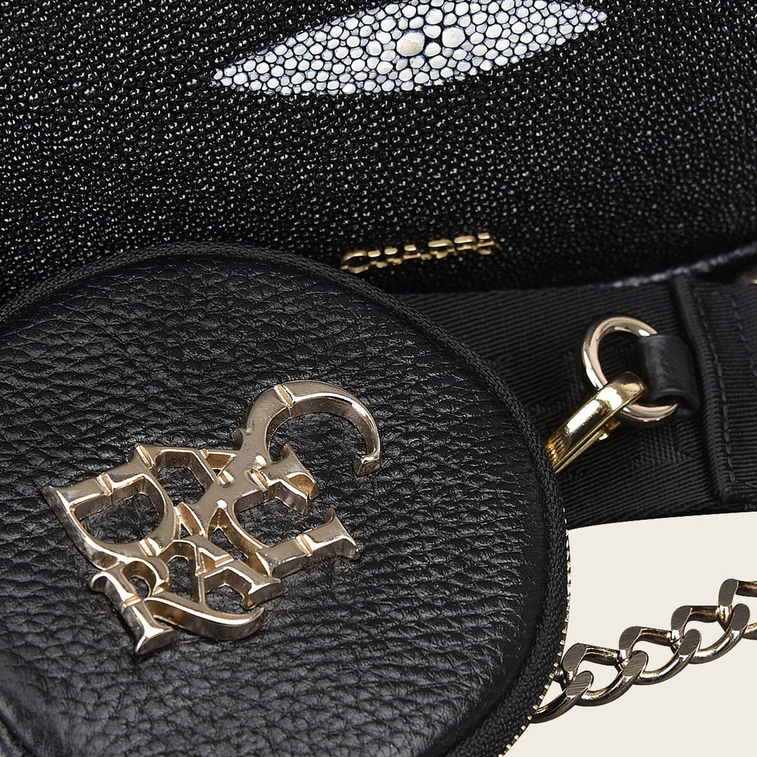 Bolso crossbody para dama en piel genuina de mantarraya y piel de bovino. Compuesta por dos bolsos desmontables. Presenta aplicaciones metálicas de logotipo Cuadra al frente de ambos bolsos y cadena metálica decorativa al frente. Asegurado con cierre. El bolso de mayor tamaño cuenta con dos compartimentos en su interior, uno de ellos con cierre. Con asa larga de tela ajustable y desmontable, de ella cuelga un bolso tipo monedero desmontable con cierre y aplicación metálica de monograma Cuadra. Color negro.