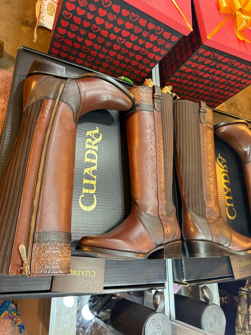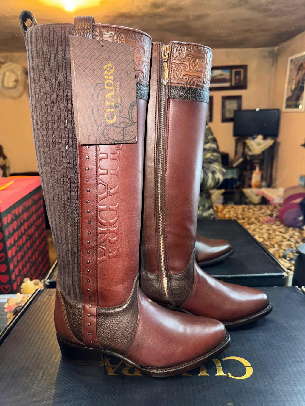 Bota alta para dama en piel genuina de bovino. El tubo presenta el logotipo de la marca Cuadra en alto relieve, correa decorativa, estoperoles metálicos y monograma Cuadra grabado en alto relieve. Con contraste de texturas. Ajustada con cierre interno y aplicación textil elástica en el tubo para mejor ajuste. Suela de cuero con injerto de TPU.