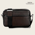 Documentera para caballero en piel genuina de venado italiano. Presenta aplicación metálica del logotipo Cuadra y dos compartimentos, el de mayor tamaño con un bolsillo interno. La parte trasera cuenta con malla textil. Con asa de textil ajustable y desmontable.