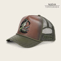 Gorra snapback con piel genuina de bovino y textil. Al frente presenta figura de alligátor y monograma Cuadra en alto relieve y contraste de color sobre piel genuina con acabado pintado a mano. Con grabado del monograma Cuadra en visera.