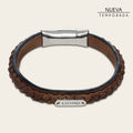 Pulsera para caballero en piel genuina de bovino y aplicación de tejido en piel genuina de carunga. Al centro con componente "Cuadra" en acabado platino. Ajustada con broche de acero inoxidable. Diámetro aproximado: 6.3 cm.