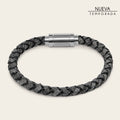 Pulsera para caballero en piel genuina de carunga. Presenta fino trenzado tubular en piel de carunga y cordón de cuero. Ajustada con broche imán de acero inoxidable con detalle "Cuadra". Diámetro aproximado: 6.3 cm.