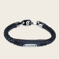 Pulsera para caballero. Con fino trenzado en piel genuina de lizard y piel de bovino. Al centro con aplicación en piel genuina de lizard y placa Cuadra en acabado platino. Ajustada con broche de acero inoxidable. . Diámetro aproximado: 6.3 cm.