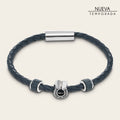Pulsera para caballero en piel genuina lizard y piel de bovino. Presenta fino trenzado tubular en piel de bovino. Con componentes metálicos y cuentas forradas en piel genuina de lizard. Ajustada con broche de acero inoxidable. Diámetro aproximado: 6.3 cm.