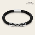 Pulsera para caballero con fino forrado tubular en piel genuina de mantarraya. Presenta componente central y broche de imán de acero inoxidable. Diámetro aproximado: 6.3 cm.