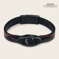 Pulsera para caballero en piel genuina de lizard con aplicaciones de piel genuina de bovino y tejido. Ajustada con broche de imán. Al centro con herraje del monograma Cuadra. Diámetro aproximado: 6.3 cm.