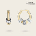 Aretes para dama en latón con baño de oro. Con aplicación de cuentas metálicas con acabado oro forradas en piel genuina de pitón y componentes Cuadra en acabado platino. Altura aproximada: 2.2 cm.