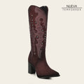 Bota para dama en piel genuina de bovino con acabado nobuk. Presenta contraste de texturas, aplicación de cadena en chinela, talón, tubo y parte superior de la bota, así como detalles de bordado en alto relieve con motivos naturales. La oreja cuenta con hebilla decorativa estilo western. Ajuste por medio de cierre interno. Suela de cuero con TPU.
