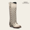 Bota alta casual para dama en piel genuina de bovino. Presenta faldón en piel genuina con bordado en color contrastante y perforado en motivos geométricos, terminado en flecos y sombreado a mano. Con aplicación de estoperoles metálicos, cadena metálica en el borde superior y aplicación metálica con el logotipo de Cuadra. La parte trasera presenta un cierre decorativo. Cuenta con planta Ortholite y plantilla flex removible que brindan mayor ligereza, confort amortiguación y resistencia. Con suela de cuero con injerto de hule.