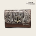 Cartera para dama en piel genuina de pitón y piel de bovino. Al frente presenta aplicación metálica del logotipo Cuadra. En su interior cuenta con ocho espacios para tarjetas, un espacio para efectivo y un monedero asegurado con cierre en la parte trasera. Asegurada con broche.