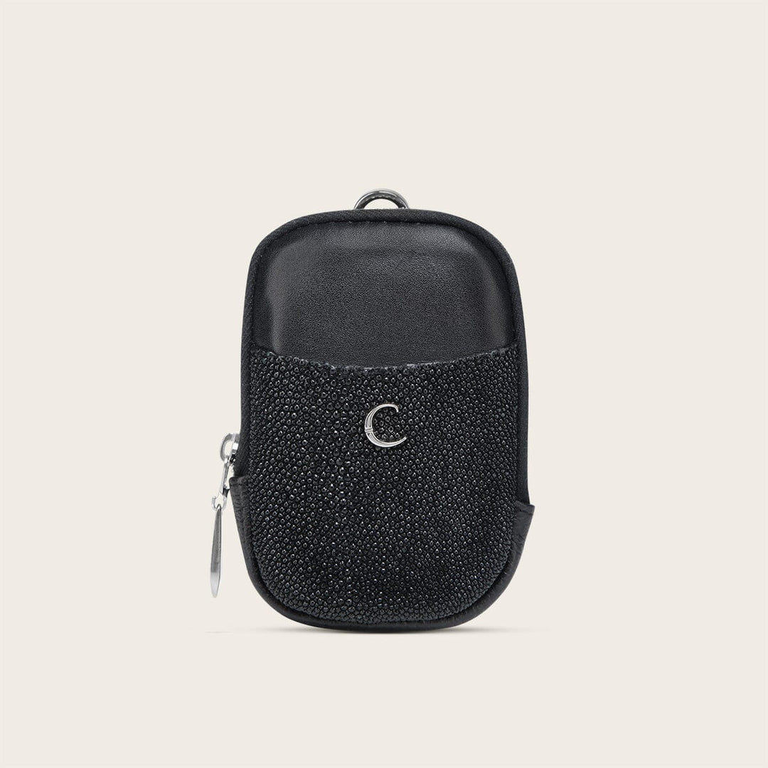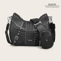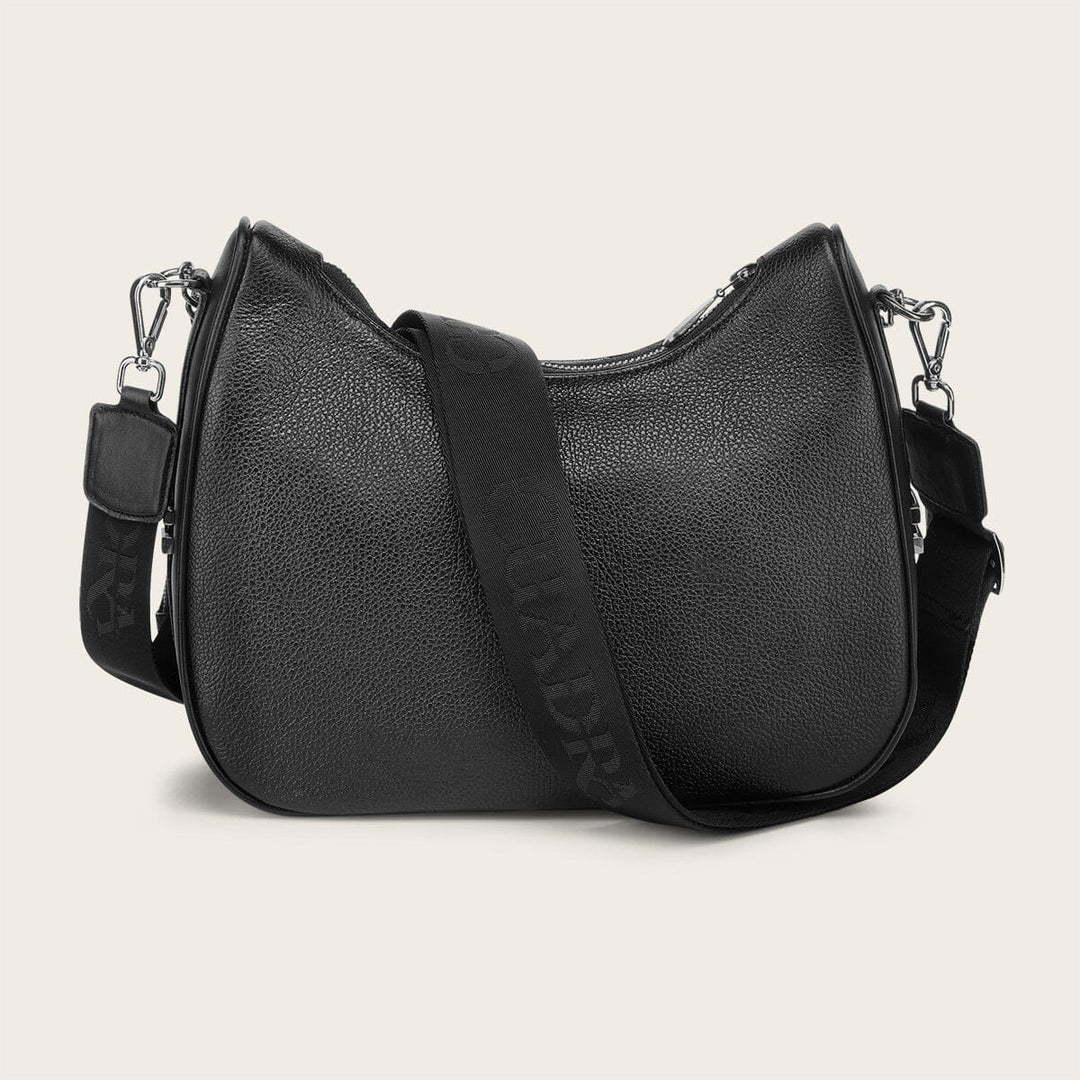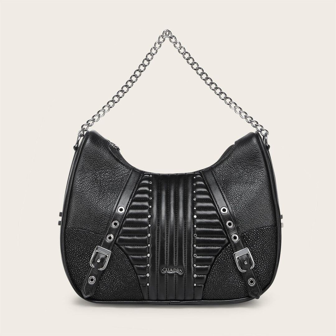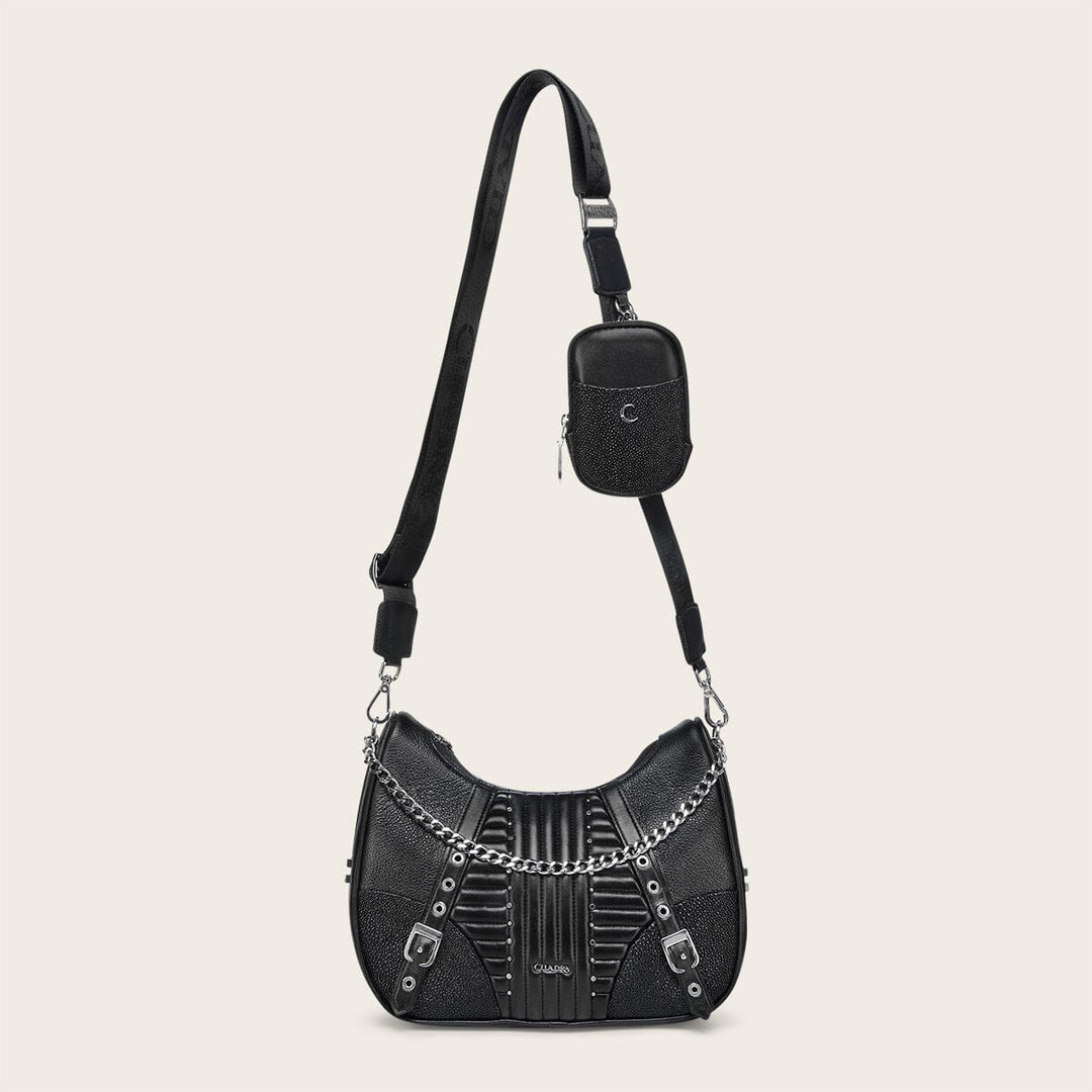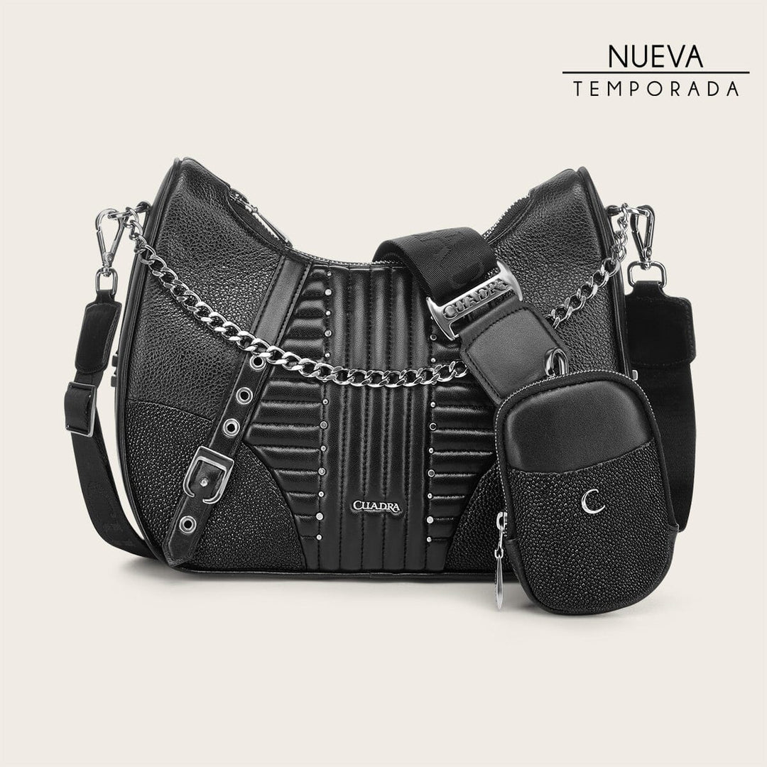 Crossbody para dama en piel genuina de mantarraya y piel de bovino. Presenta capitonado, estoperoles, ojillos metálicos, hebilla decorativa, aplicación metálica del logotipo Cuadra y un monedero desmontable. Con asa de cadena y asa larga de textil ajustable y desmontable. Asegurado con cierre.
