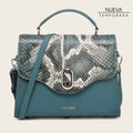 Bolso de mano estilo satchel para dama en piel genuina de pitón y piel de bovino. Presenta aplicación metálica del logotipo Cuadra y acabado pintado a mano sobre la piel de pitón. El interior cuenta con un bolsillo asegurado con cierre. Con un bolsillo trasero asegurado con imán. Con asa corta y asa larga ajustable y desmontable. Asegurado con broche giratorio e imán.