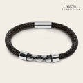 Pulsera para caballero con fino forrado tubular en piel genuina de mantarraya pulida. Presenta componente central y broche de imán de acero inoxidable. Diámetro aproximado: 6.3 cm.