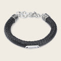 Pulsera ajustable para caballero en piel genuina de lizard. Presenta aplicaciones en acero inoxidable y componente Cuadra con acabado platino. Asegurada por medio de una cadena ajustable. Diámetro aproximado de 6.3 cm