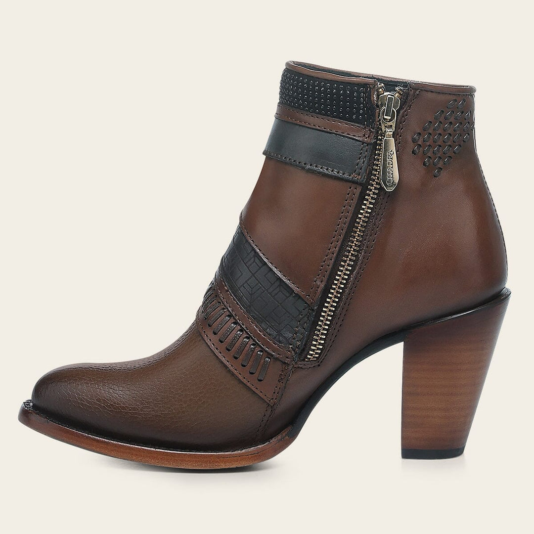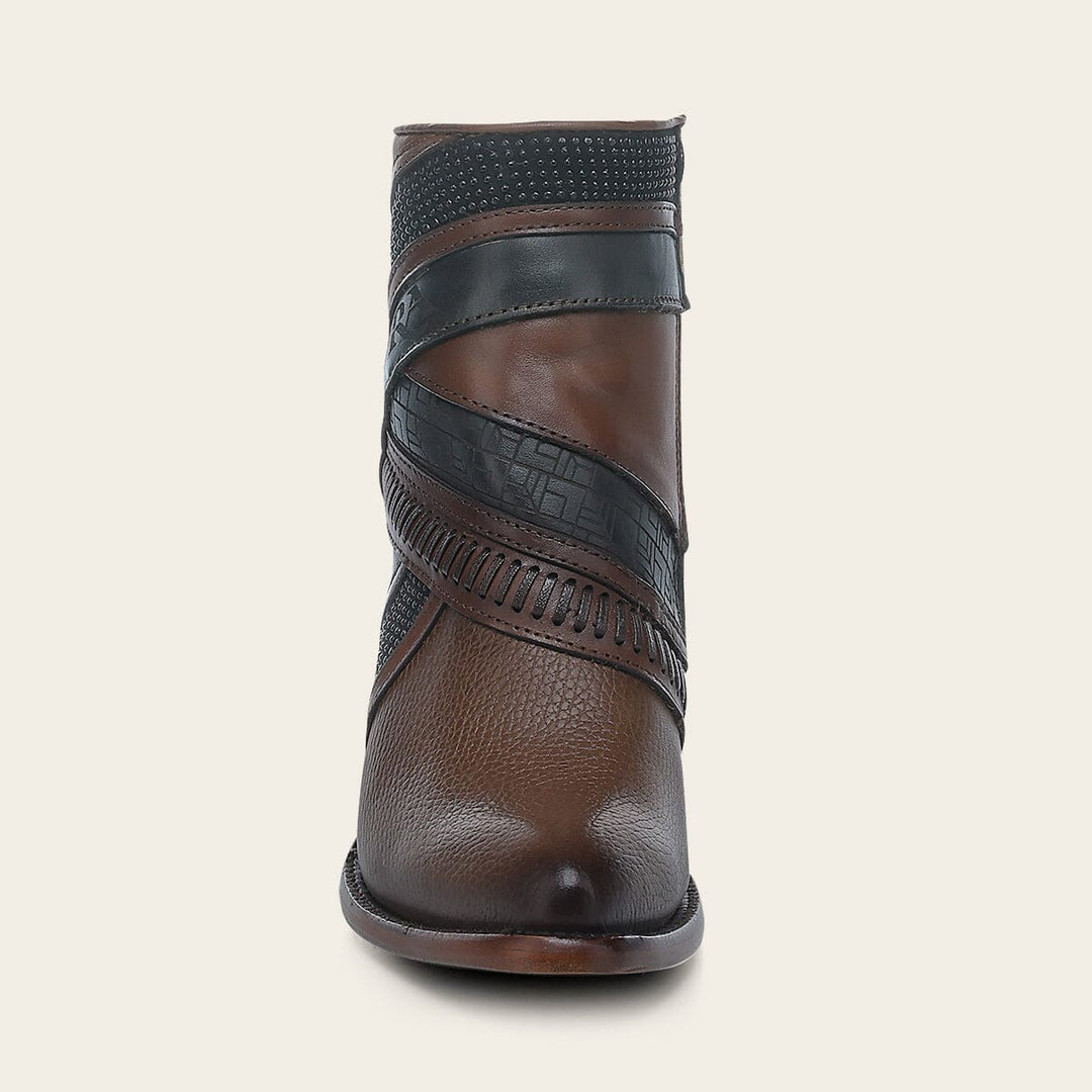 Botín para dama en piel genuina de bovino. Presenta detalles de tejido artesanal, grabado de logotipo Cuadra y motivos geométricos. Con aplicaciones metálicas y cierre interno. Suela de cuero con injerto de TPU.