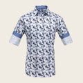 Camisa Cuadra para caballero 100% algodón. Presenta estampado en contraste de color en motivos orgánicos. Ajuste con botones frontales y en mangas.