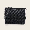 Bolso de hombro para dama en piel genuina de ovino. Presenta fino tejido artesanal con aplicación de cristales auténticos Swarovski® y estoperoles, aplicación metálica del logotipo Cuadra y cadena metálica decorativa al frente. En su interior cuenta con tres compartimentos, uno de ellos asegurado con cierre. Asa larga desmontable y ajustable, adaptable para usarse como crossbody. Asegurada con cierre.
