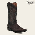 Bota vaquera Orígenes para caballero en piel genuina de elefante y bovino. Presenta sombreado a mano, herraje metálico del monograma de la marca sobre piel genuina de elefante, bordado en alto relieve, tejido artesanal y grabado láser en motivos orgánicos. Cuenta con el logotipo Cuadra en el costado y en la parte trasera, la leyenda “Cuadra Tradicional”. Con piel genuina de elefante en las orejas. Suela de cuero con injerto de TPU antiderrapante.