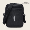 Bandolera para caballero en piel genuina de mantarraya y piel de bovino. Presenta contraste de texturas, aplicación metálica del logotipo Cuadra y acabado platinado. Con dos compartimentos asegurados con cierre, el de mayor tamaño cuenta con dos bolsillos internos. Con asa de textil ajustable.